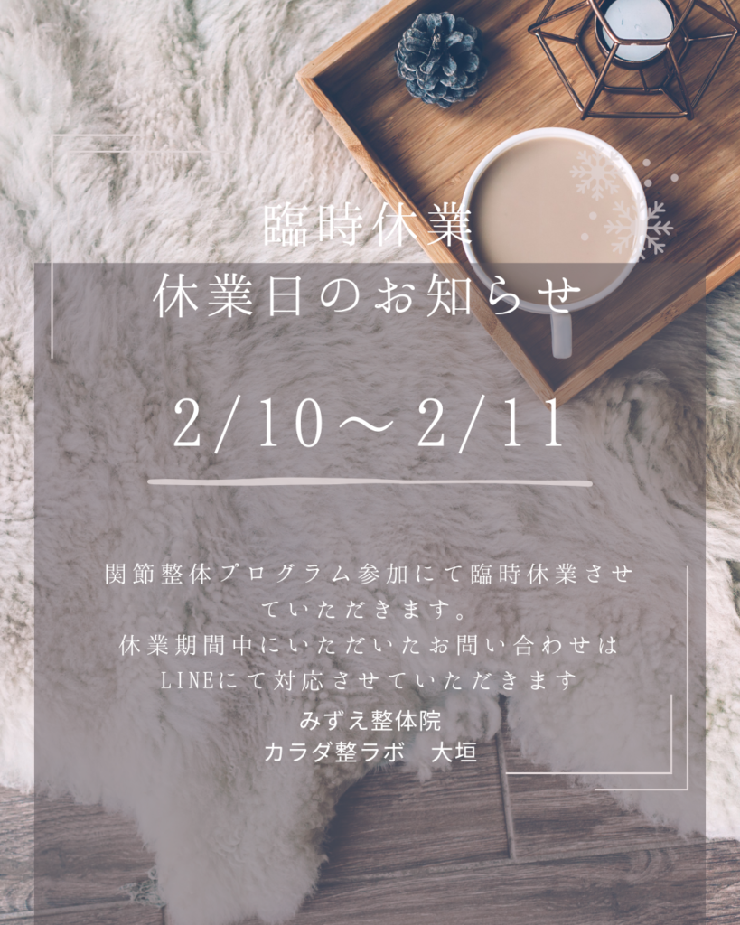 お休みのお知らせ|大垣市で腰痛・膝痛・五十肩でお困りの方はみずえ整体院・カラダ整ラボ大垣