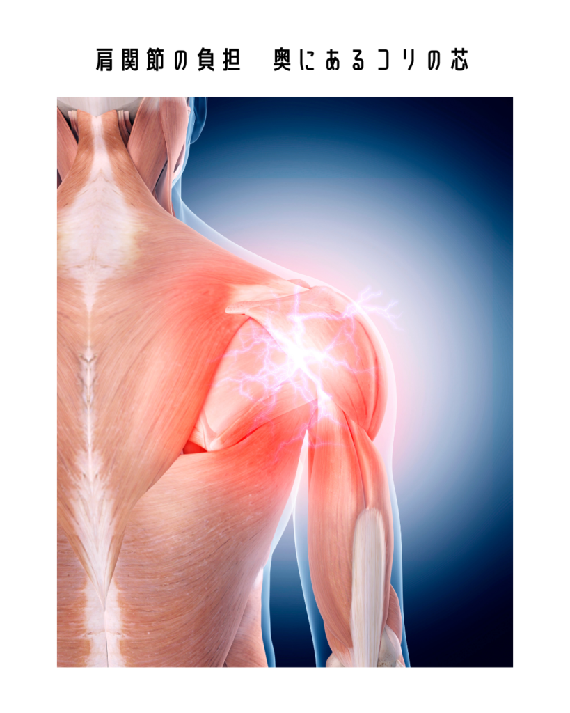 肩関節の奥に位置する筋肉の硬結や癒着が原因の一部になります。これが肩関節の負担に繋がります。